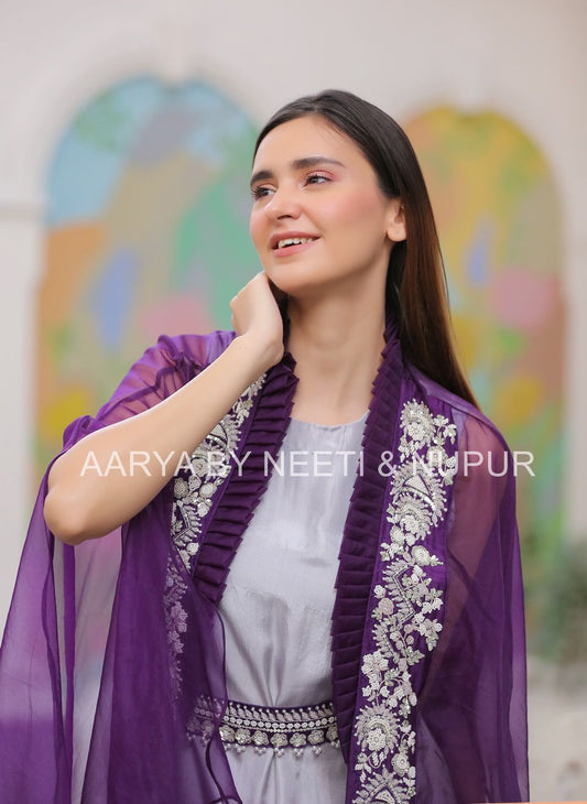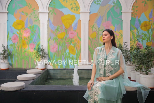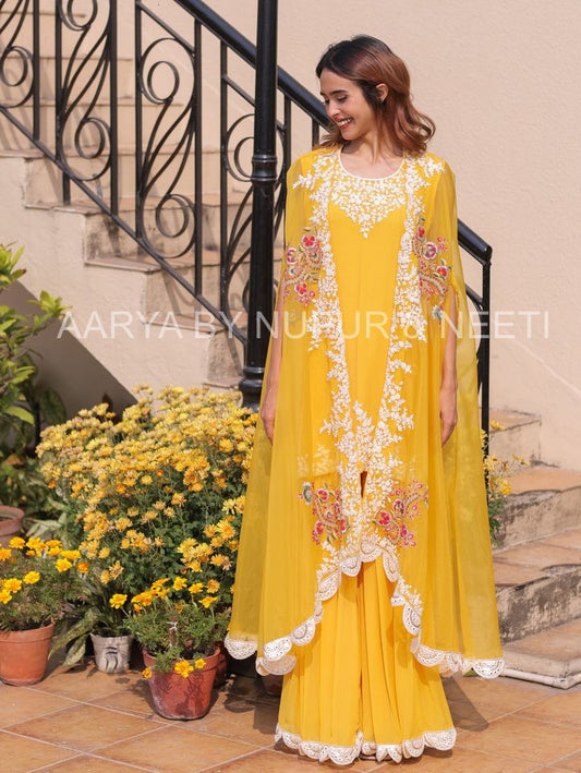 Cape Set With Sharara Hand Embroidered Organza Cape With Sleeveless Kurta & Sharara