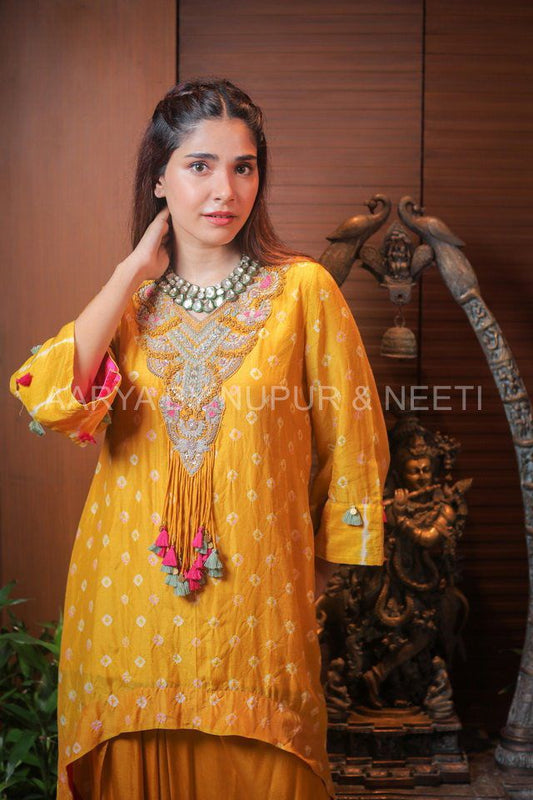 Bandhej Asymmetrical Kurta With Zardosi Yoke & Tassels With Dhoti