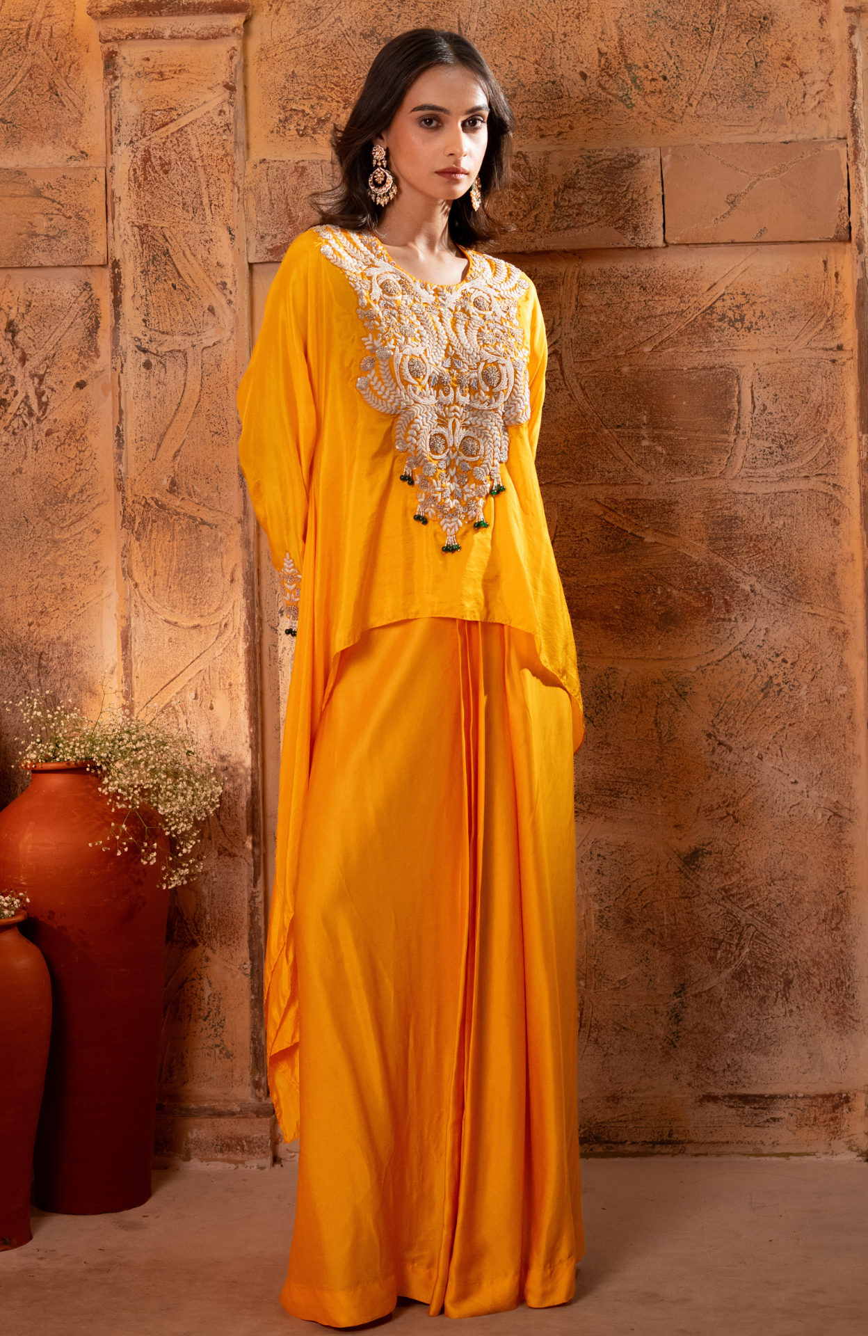 Crafted in lustrous silk, this top features an intricately hand-embroidered yoke adorned with striking green embellishments that lend a pop of refined elegance. Paired with a flowing modal satin skirt, the ensemble creates a beautifully balanced silhouette—modern, graceful, and perfect for celebrations that call for effortless sophistication.